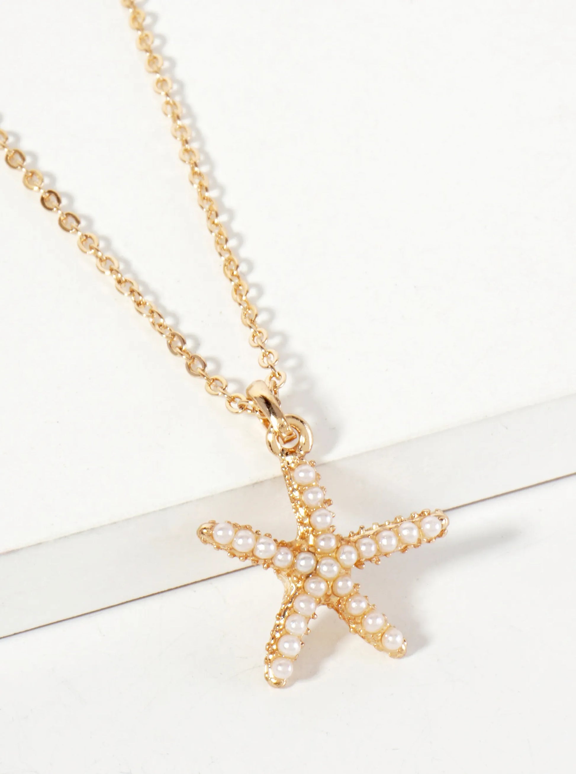 This stunning piece features a delicate 18K gold-plated chain paired with a beautifully crafted starfish charm, adorned with luminous pearls for a refined, beachy glow. Perfect for summer outfits or gifting, it adds a playful yet sophisticated touch to any jewelry collection.